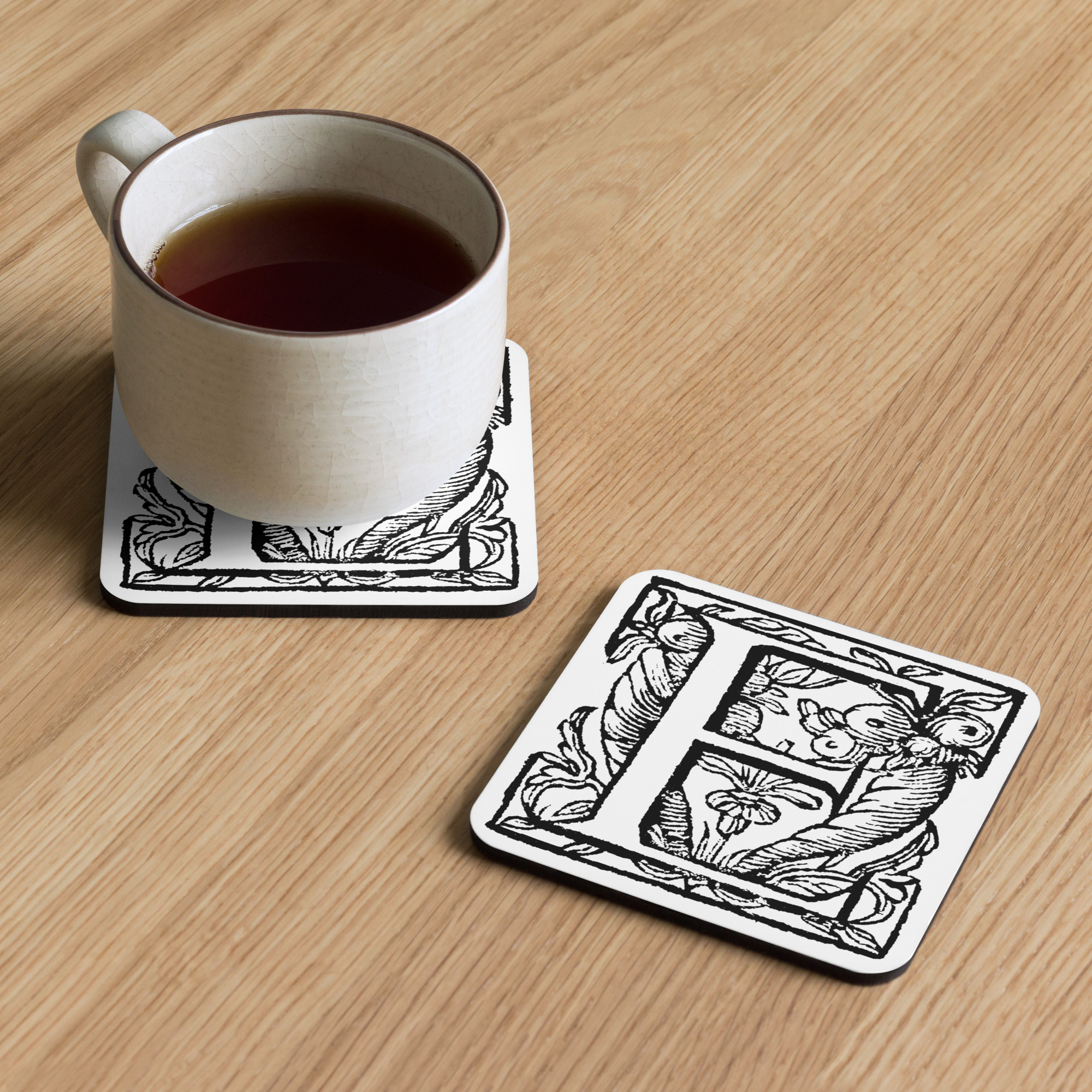 Cork-back coaster – Antique letter E with Cornucopia horn
