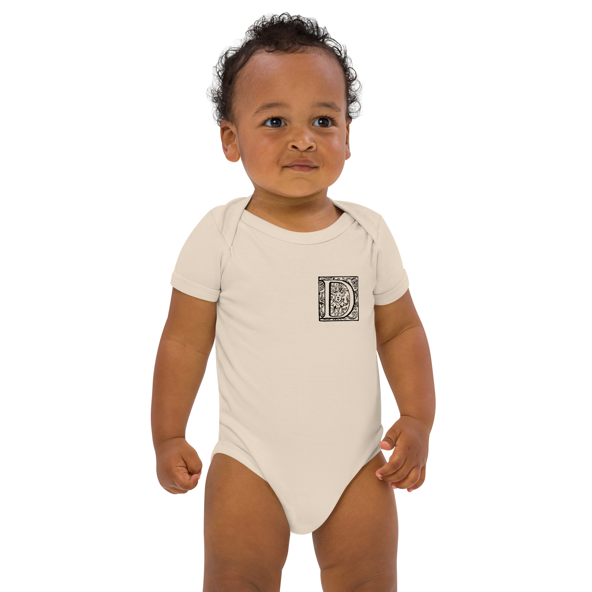 Organic cotton baby bodysuit – Antique Letter D