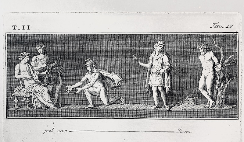 A rectangular fresco with dark background with the tale of Apollo and the Satyr marcias who had dared compete with Apollo in his ability to play the Tibias. This file download is for personal or educational uses only.
