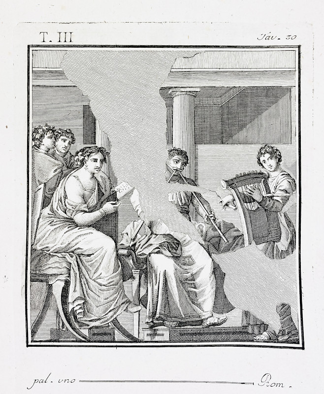 Ancient Rome – Downloadable image file: fresco, musical concert, guitar, tibia, singer, poet- Antique 18th century print.