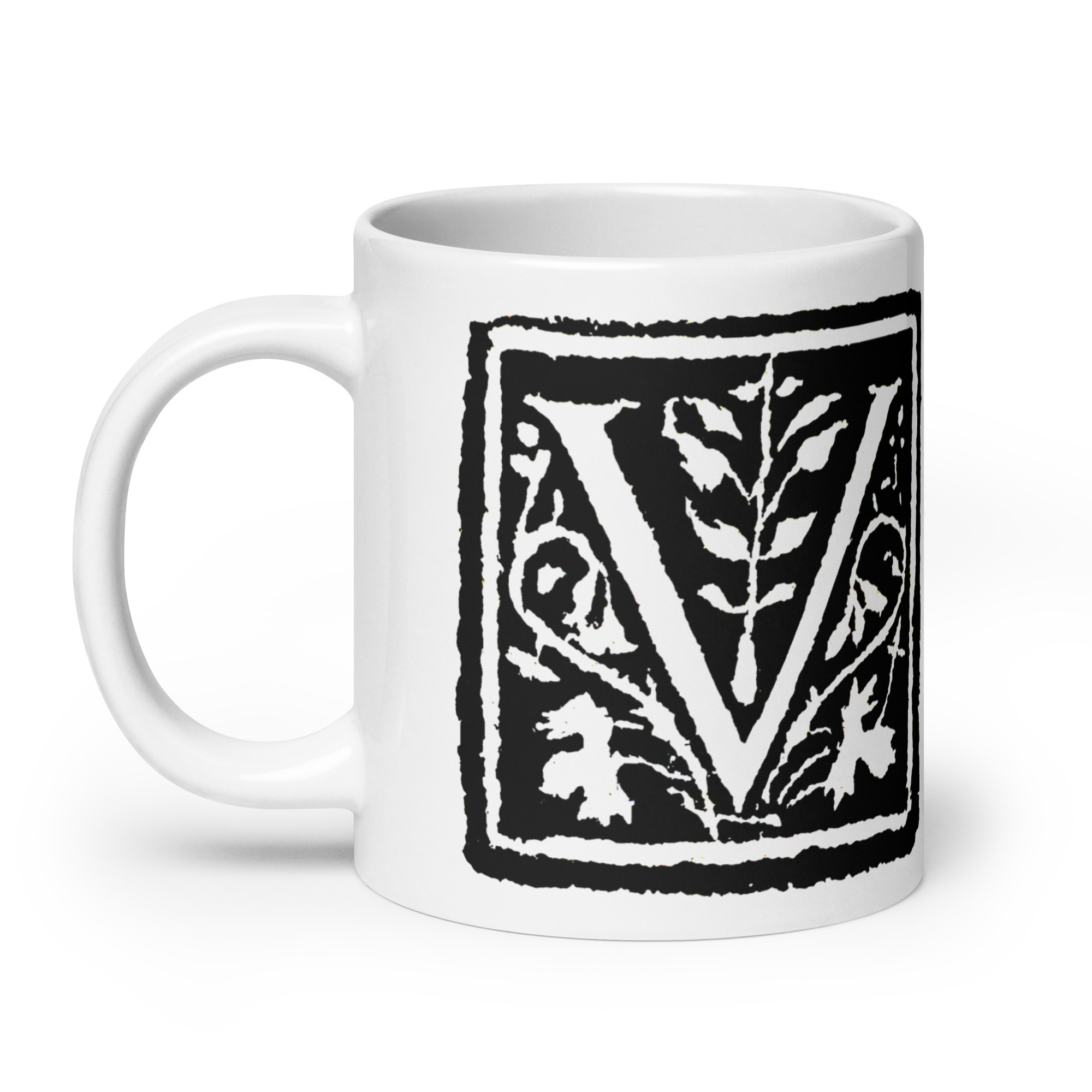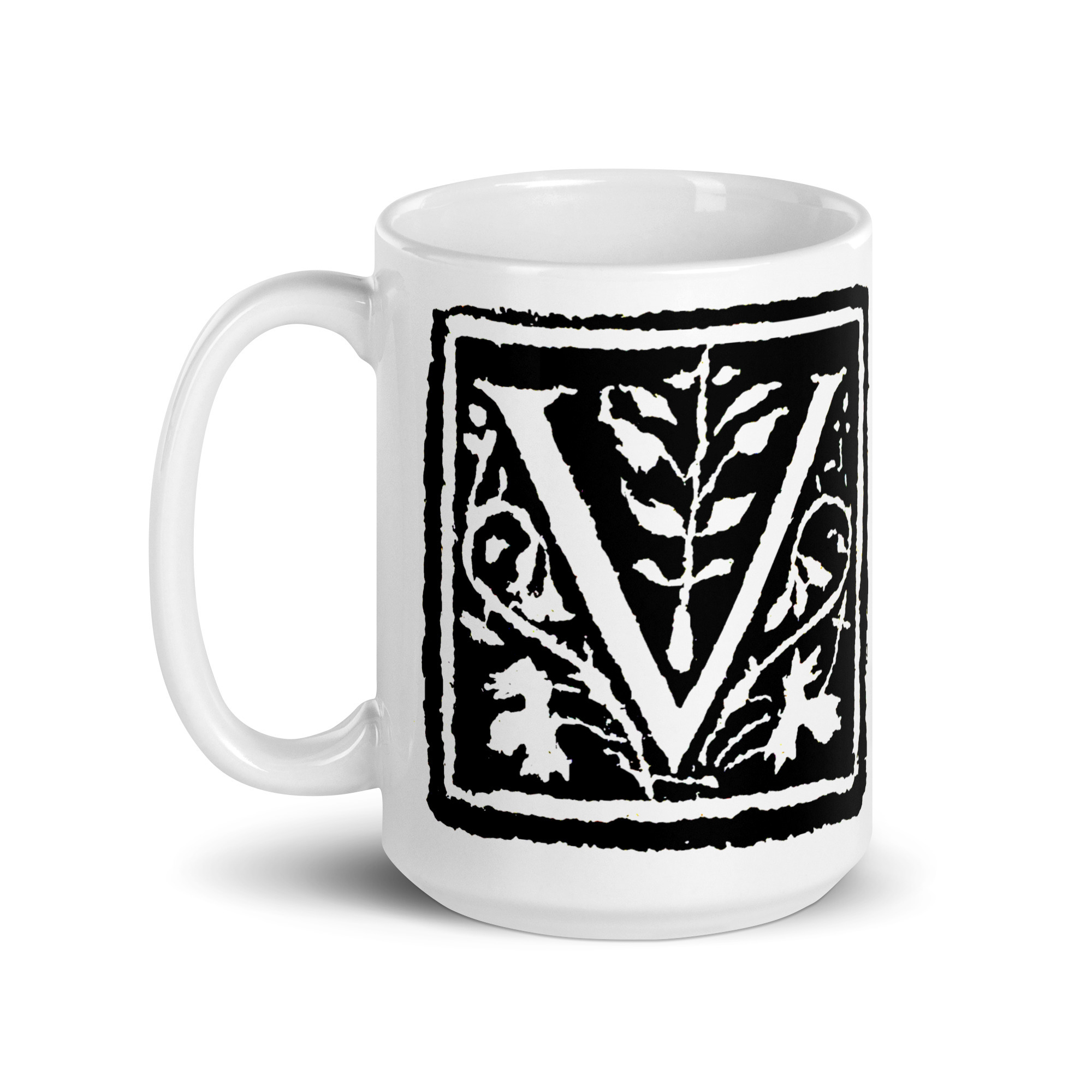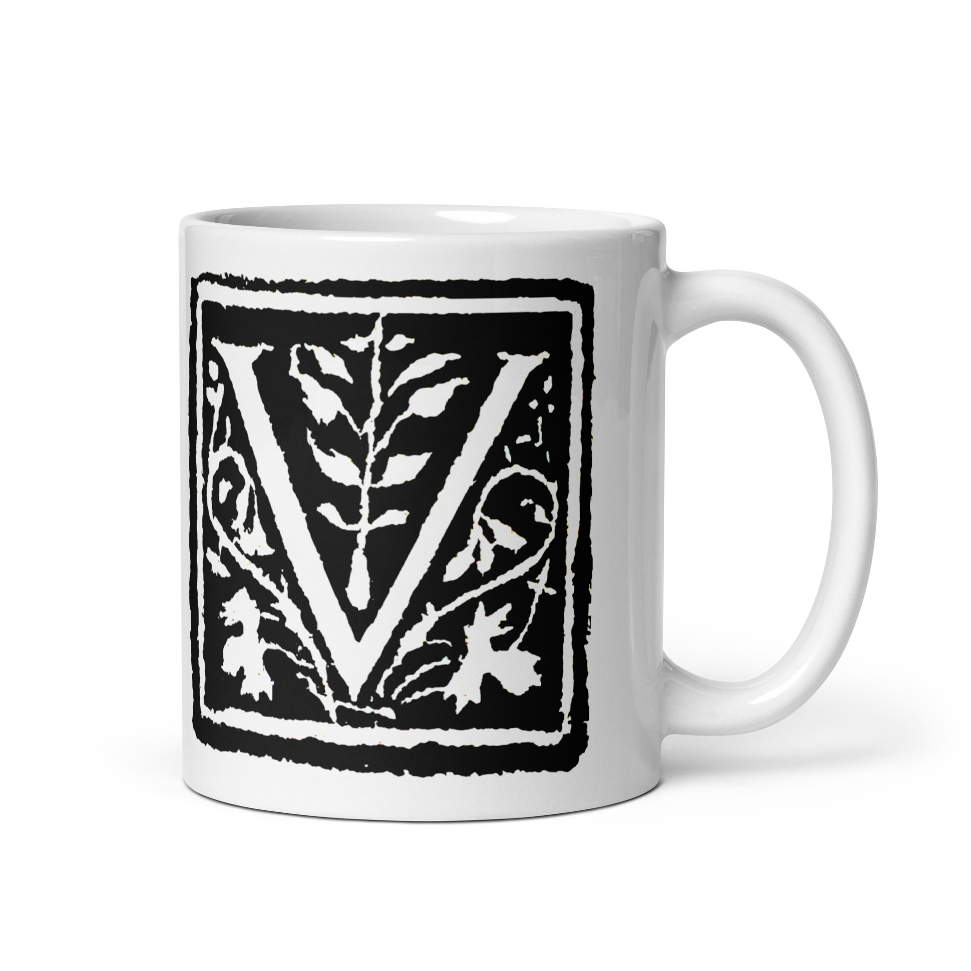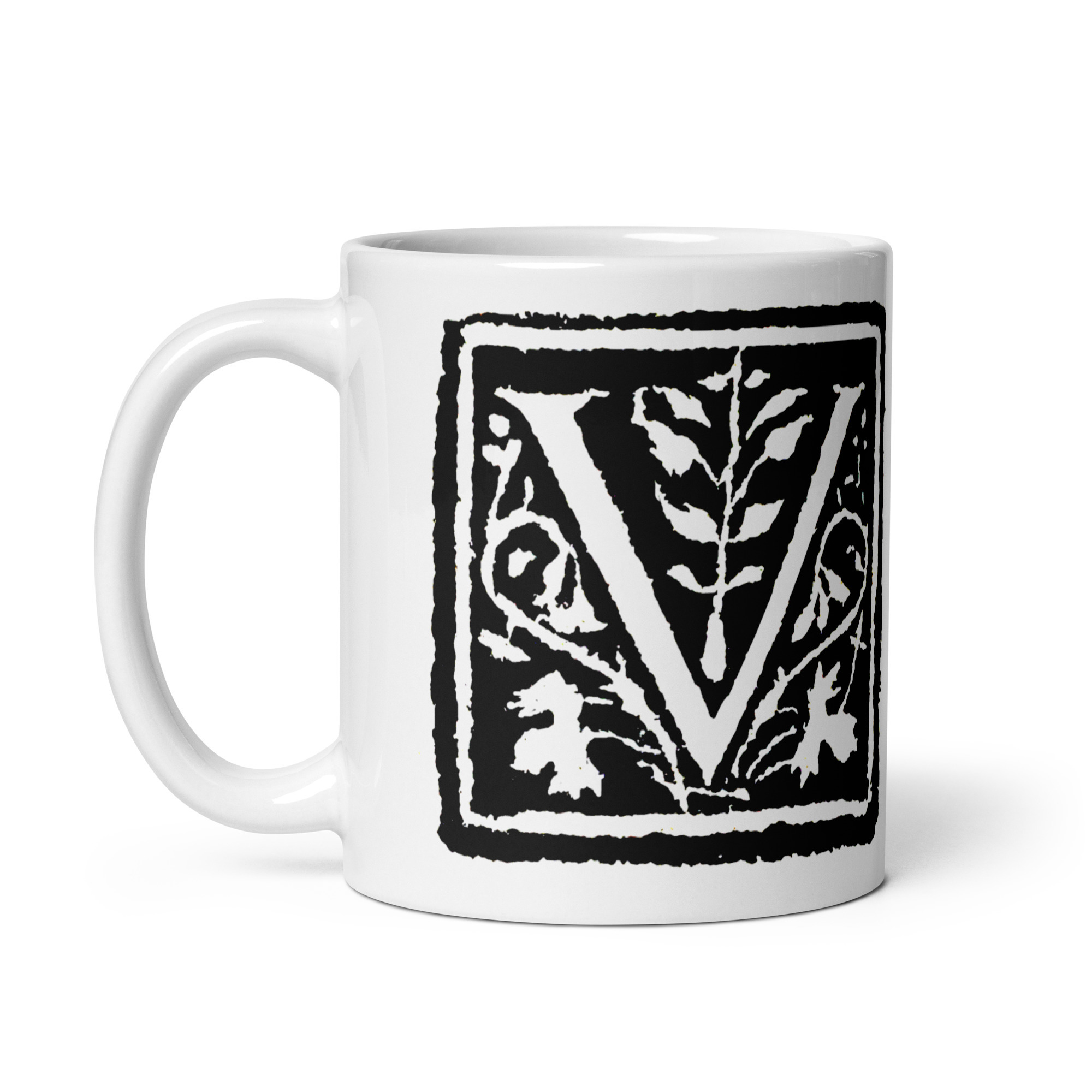 White glossy mug -Antique Letter V